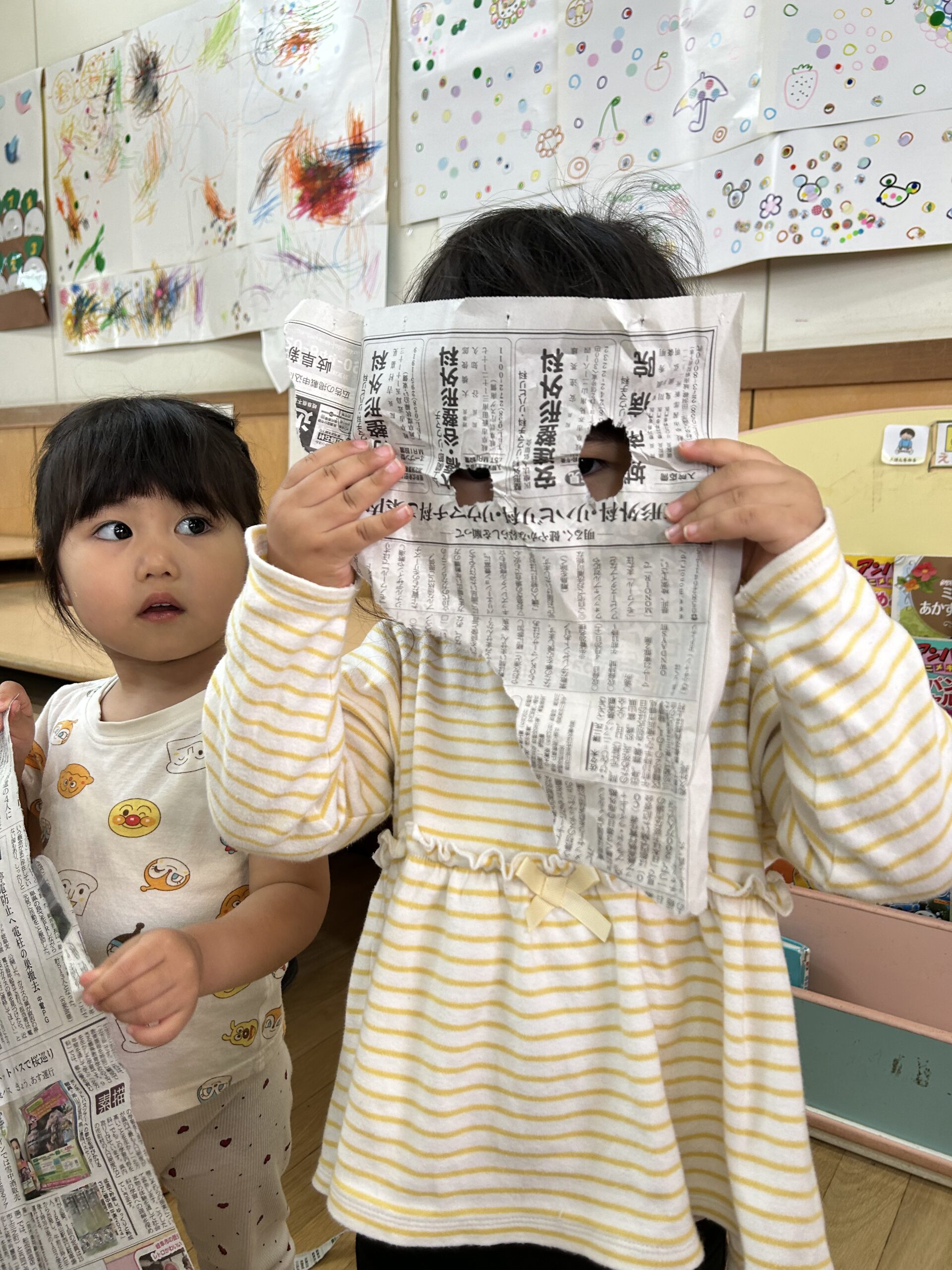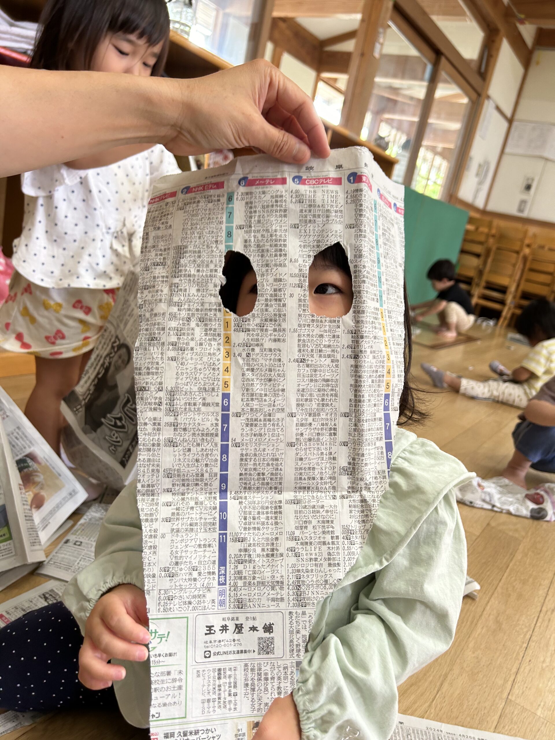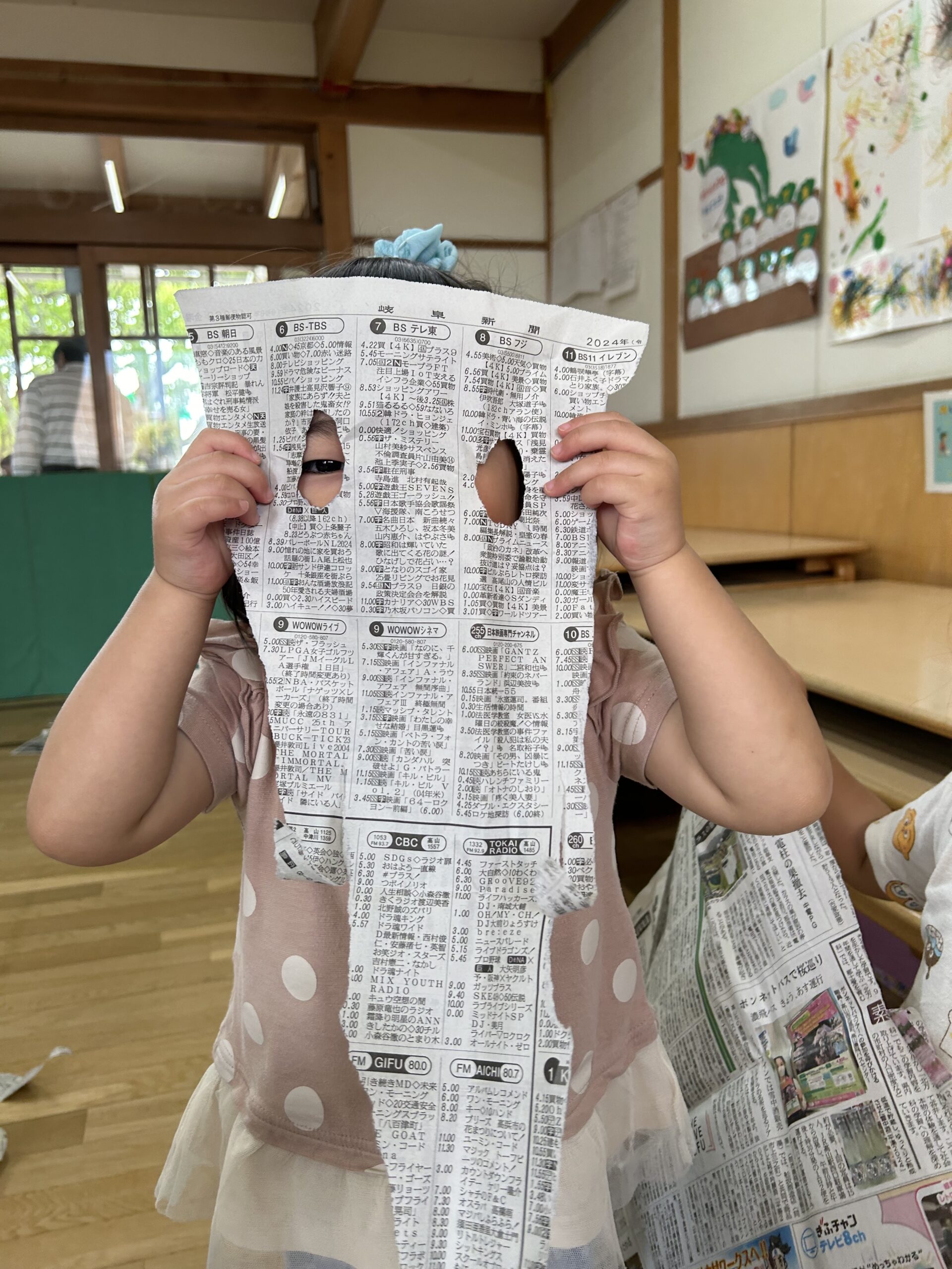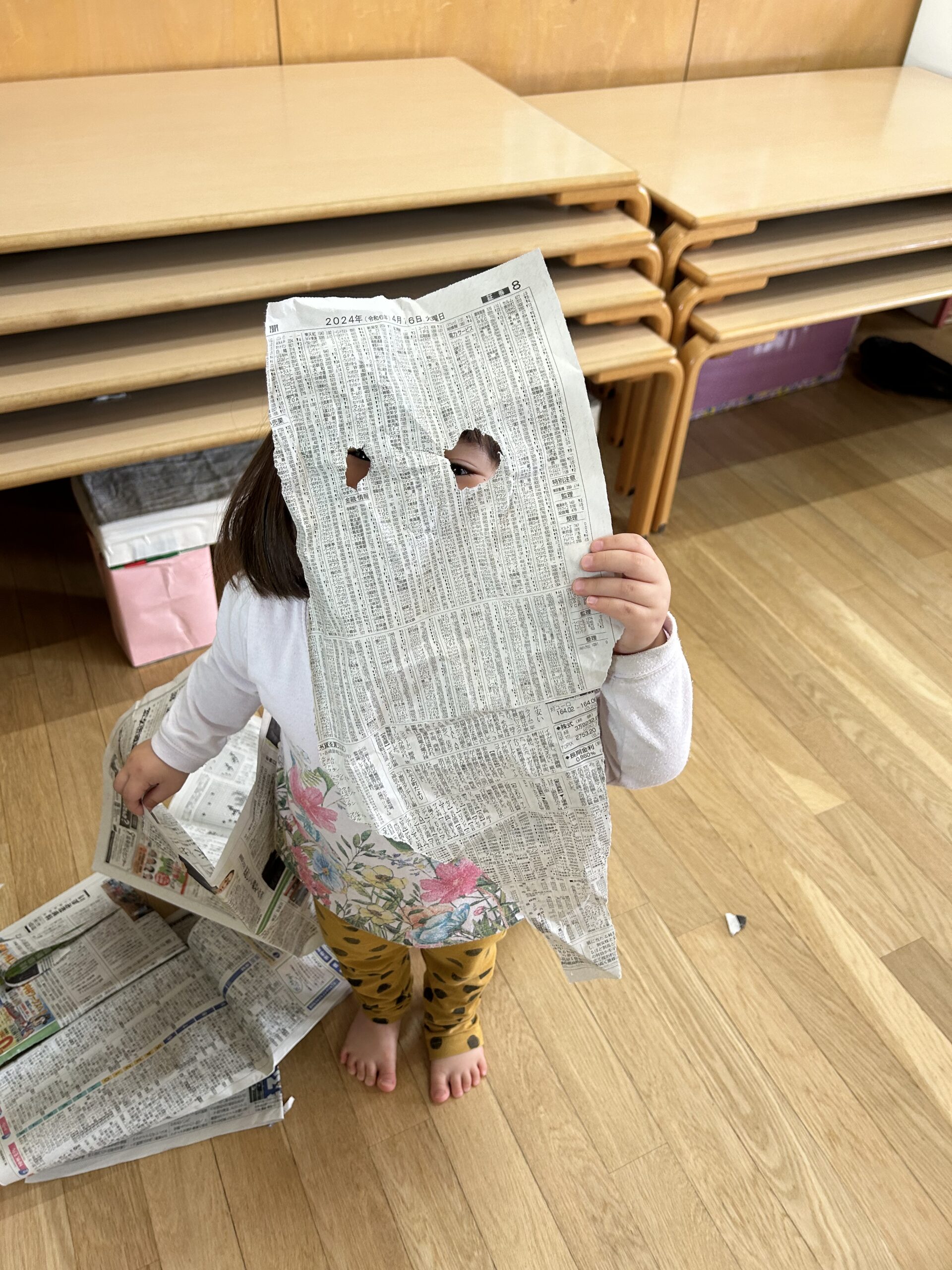 「新聞でおばけ作ろ〜!」の保育士の声かけに