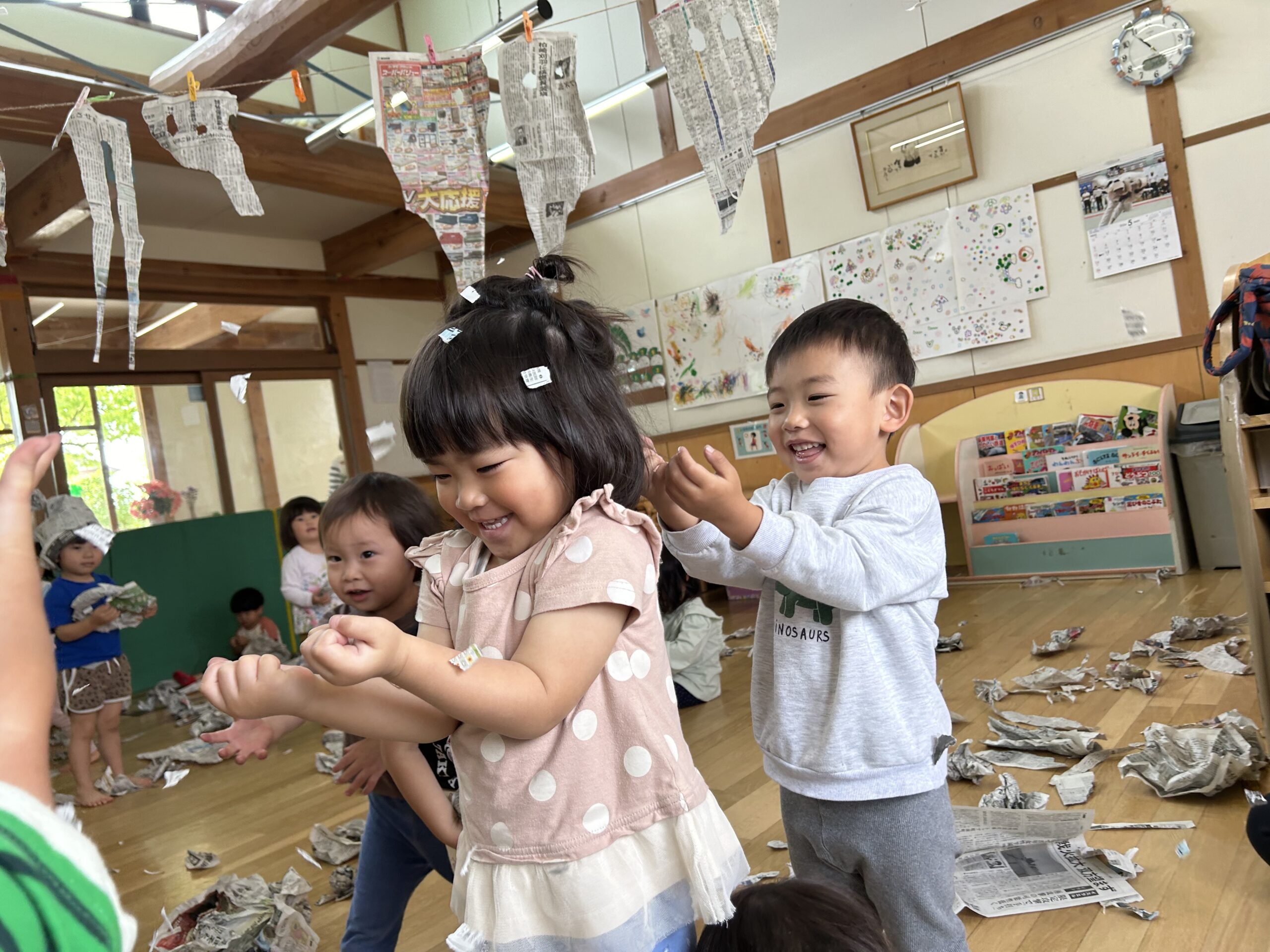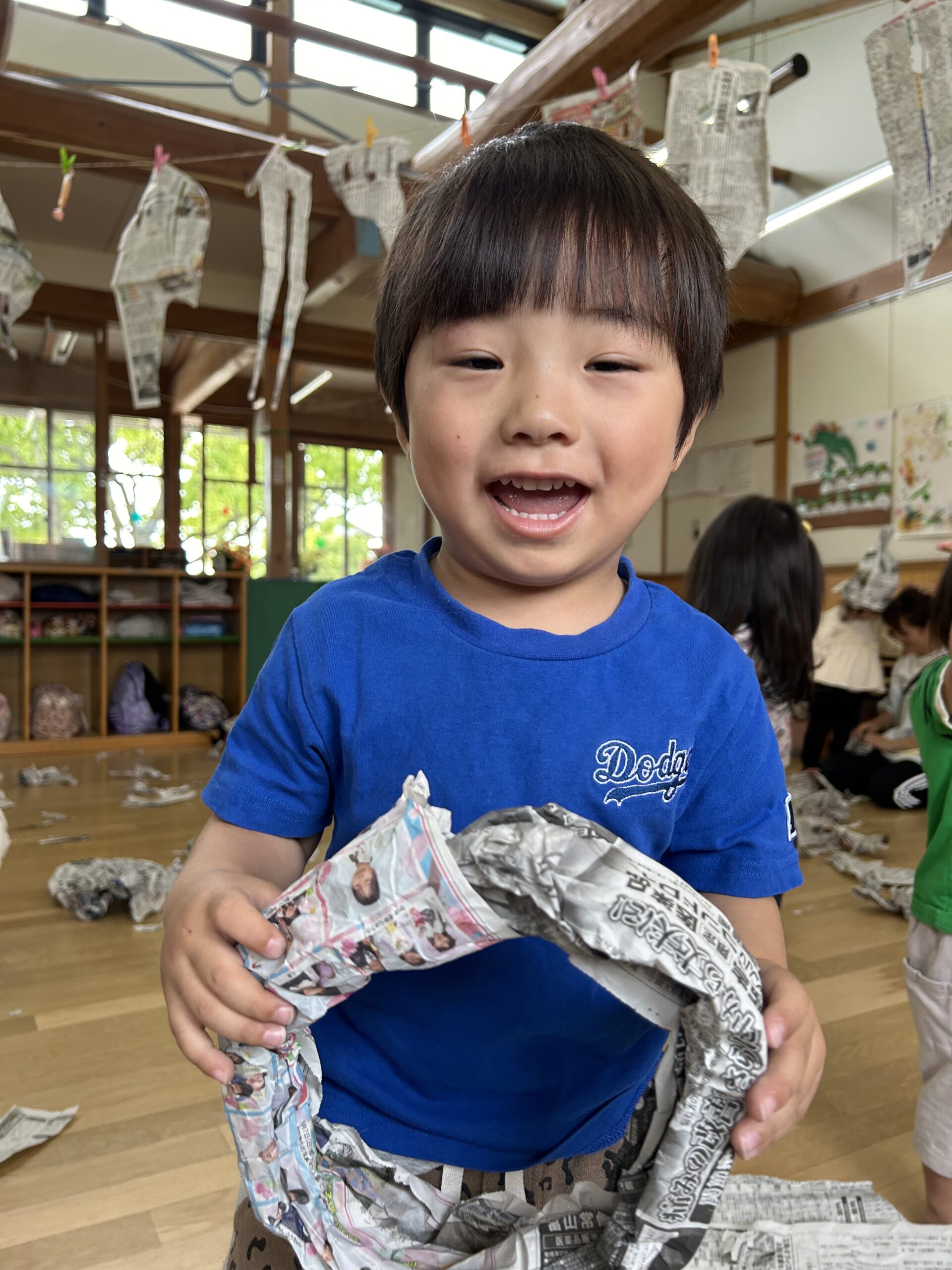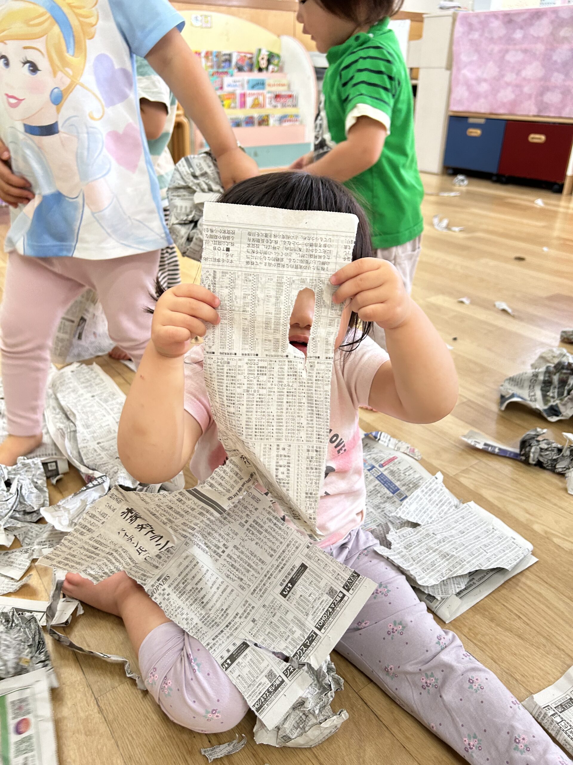 「新聞でおばけ作ろ〜!」の保育士の声かけに