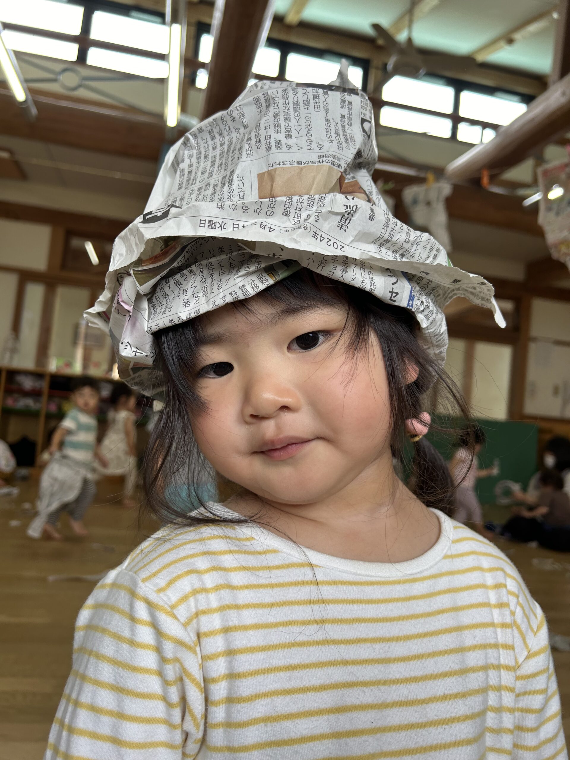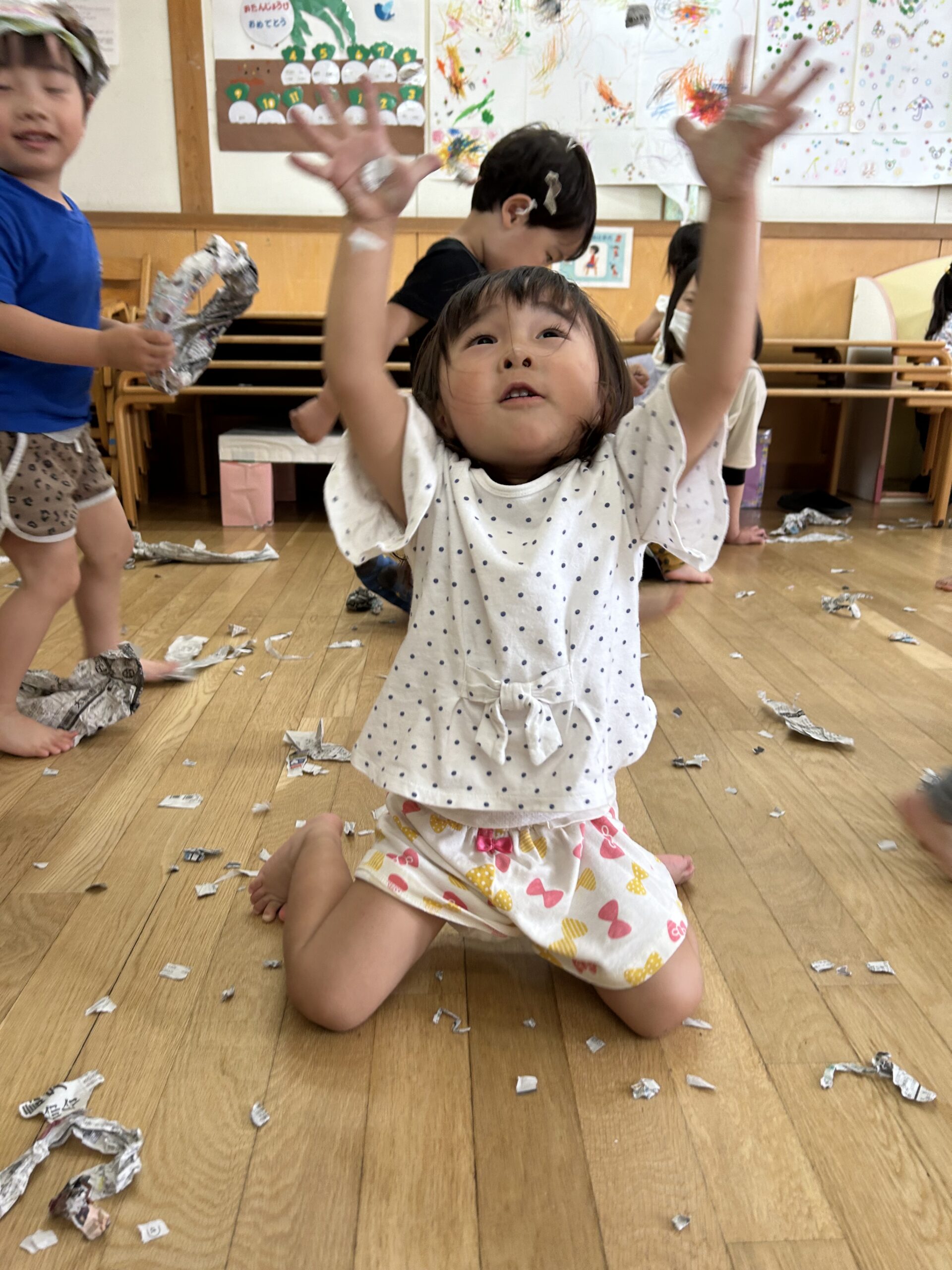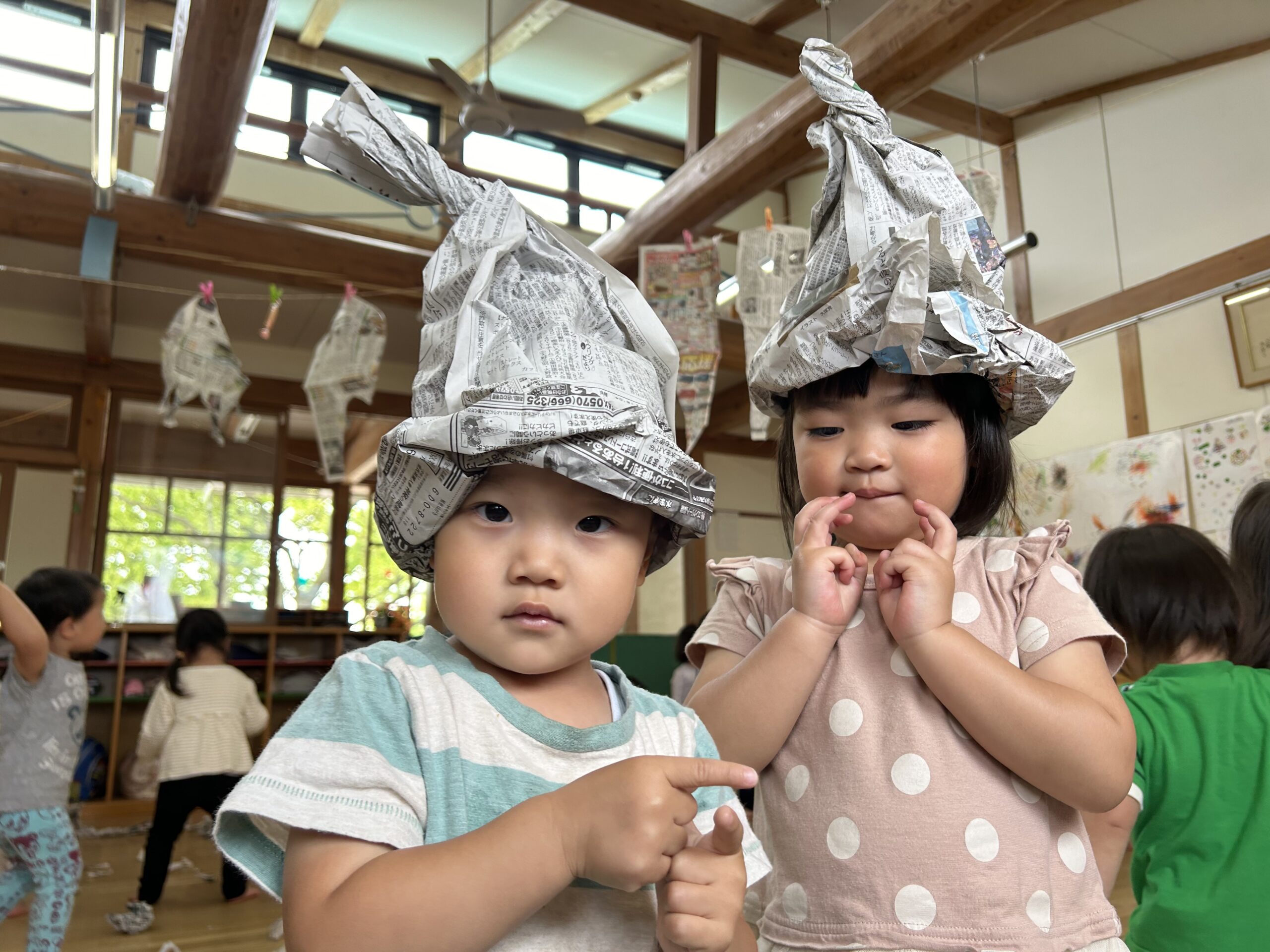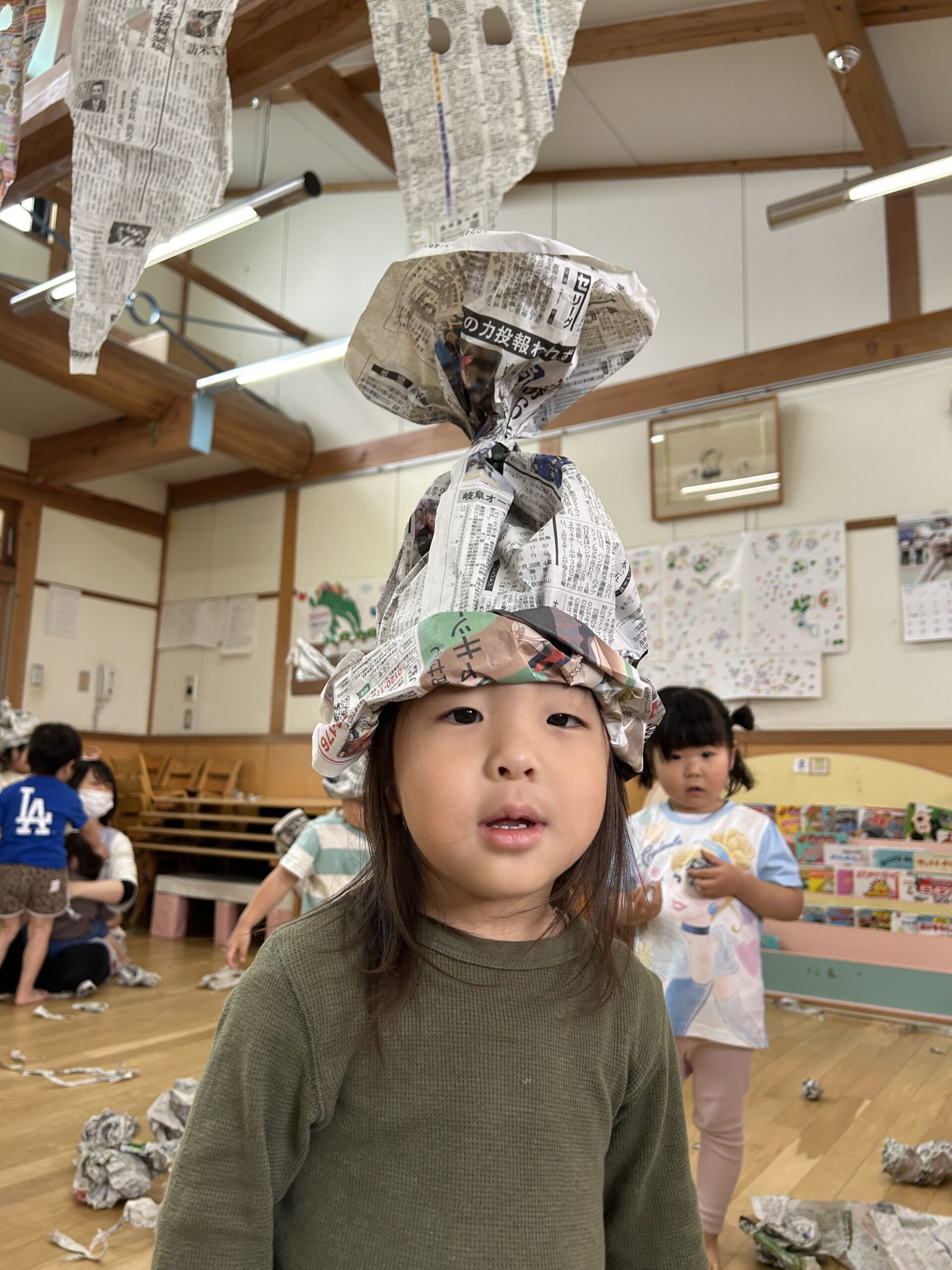 「新聞でおばけ作ろ〜!」の保育士の声かけに
