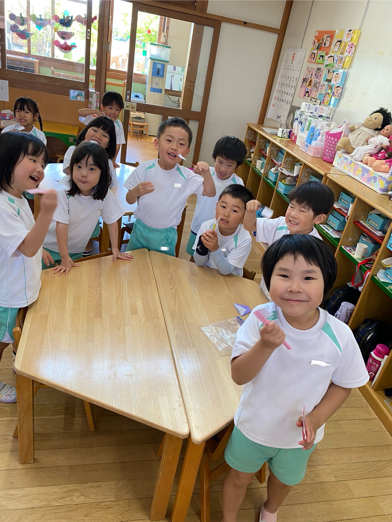 折り紙で作った歯ブラシで『はをみがきましょう』の歌に合わせての歯みがきごっこ♪