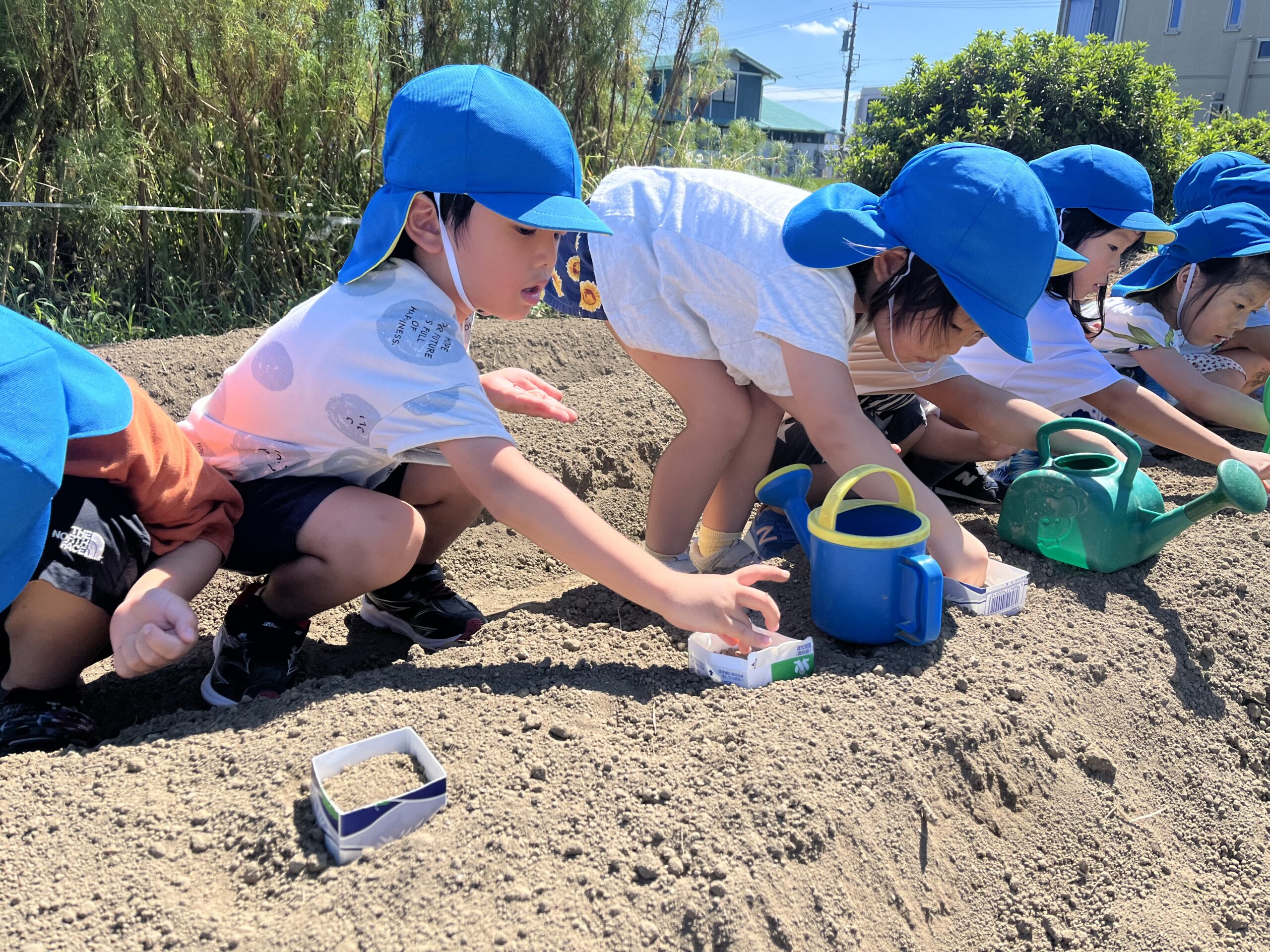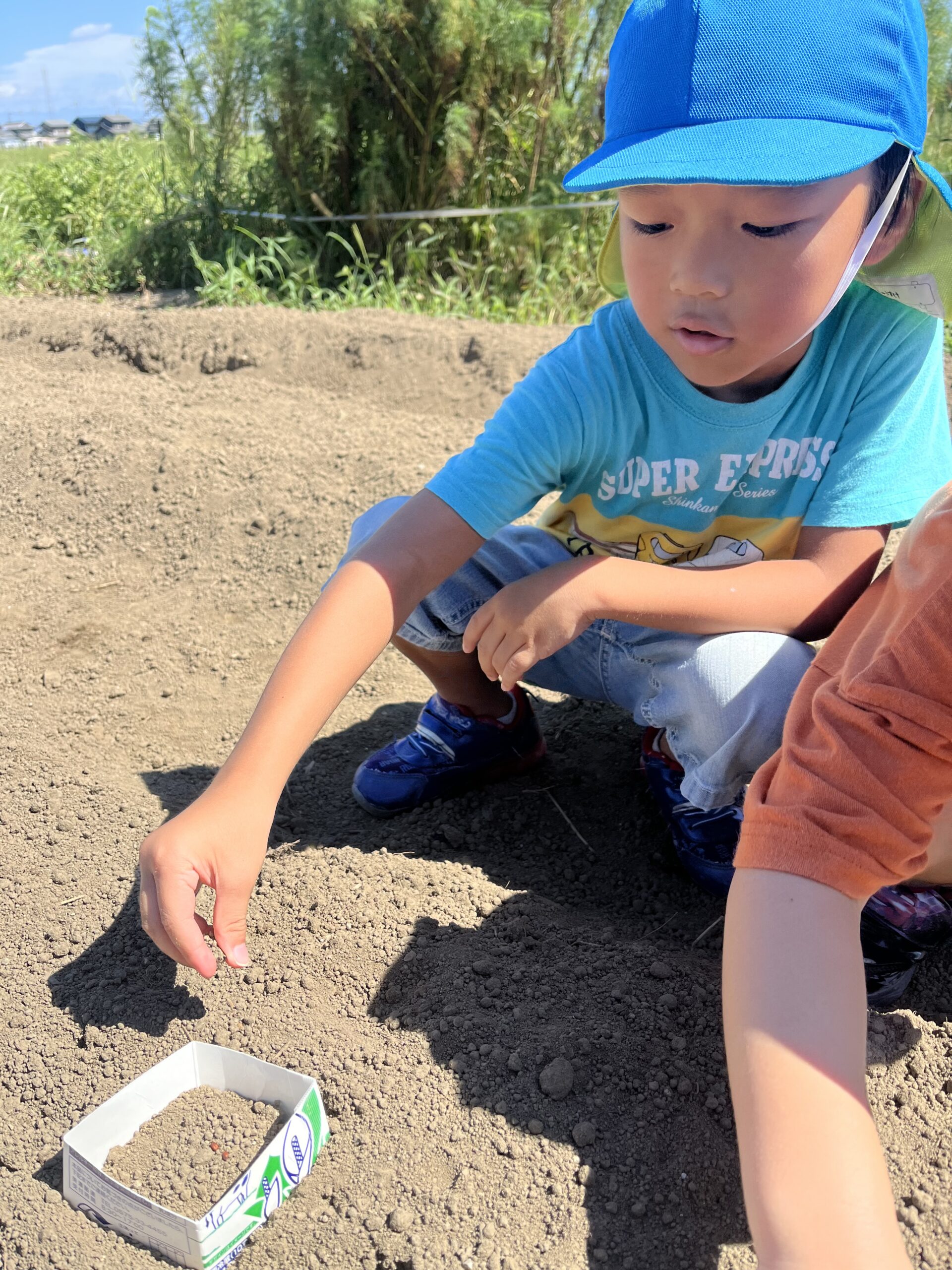 野菜の種まきしたよ! 2024.10.02 ★あやめ組★ だいこん、小松菜、ほうれん草 の種まきをしました! ◎だいこん 『お母さん指で穴あけよう!』 だいこんの種を入れるお家を作ります! 大きな、だいこんが出来ますように。。。 ◎小松菜 『だいこんより、種が小さいね!』 野菜の種の大きさもいろいろあることを 発見した子どもたちです♬ 『美味しい野菜になるのが楽しみだね💓』 と野菜の生長を今か今かと待っています♬ < >