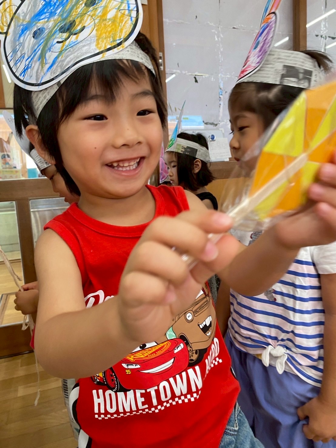 自分で色塗りしたお面をかぶって、