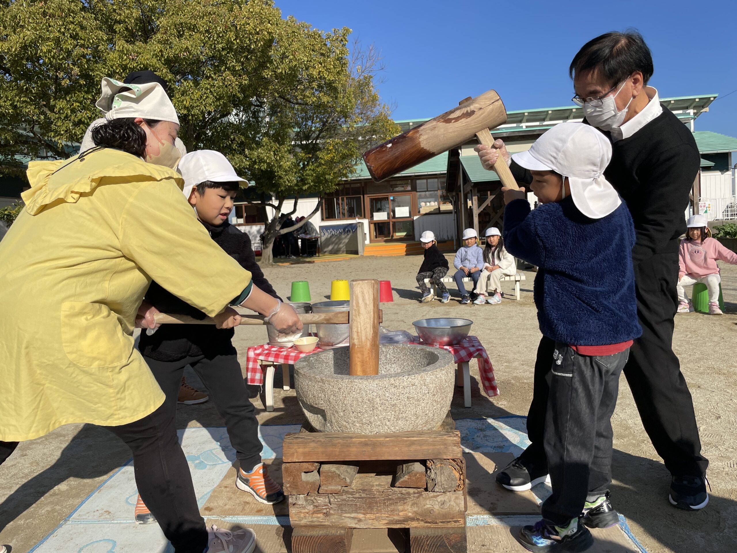 5歳児も順番に杵を持って、おもちつきに挑戦!