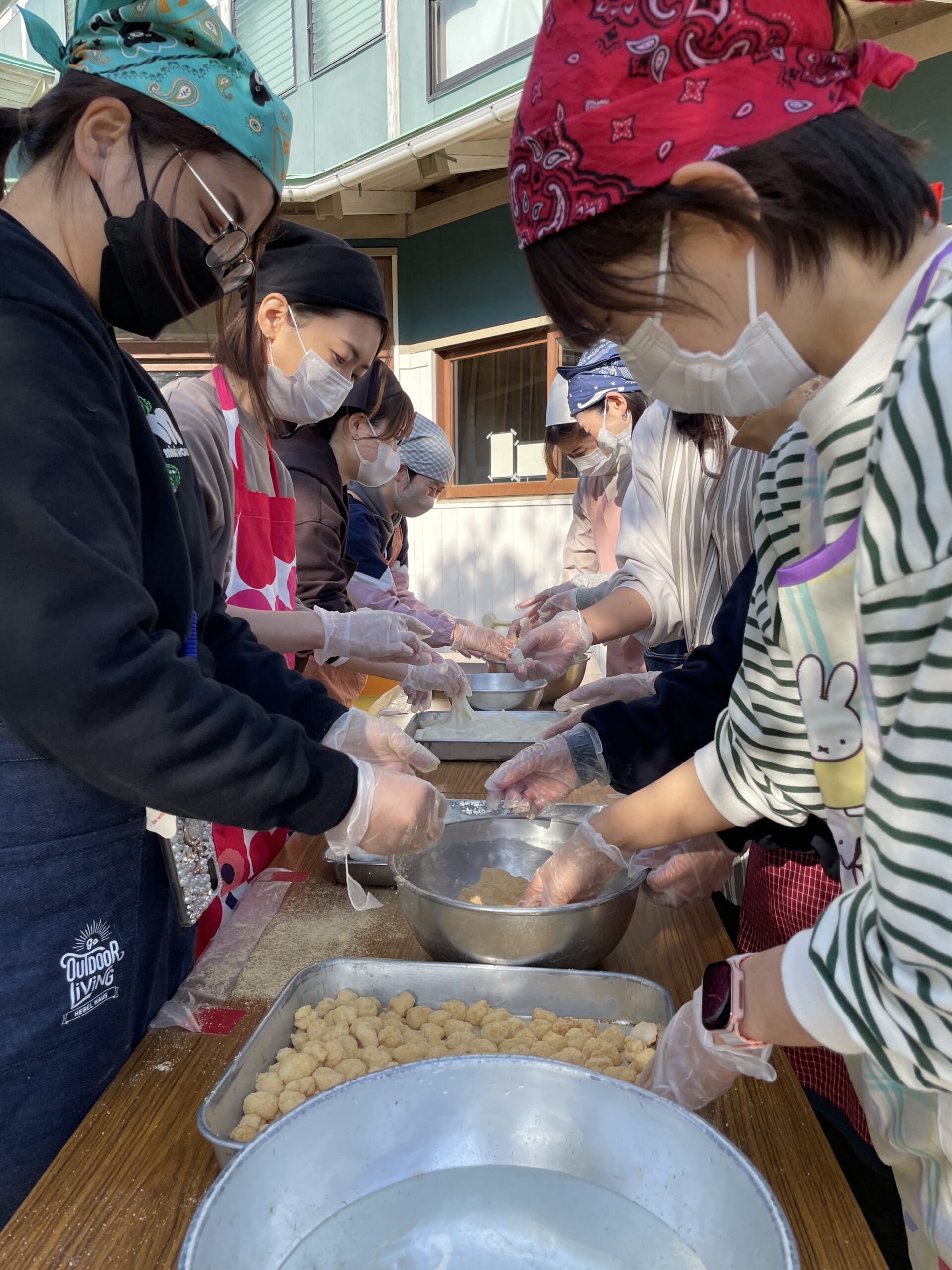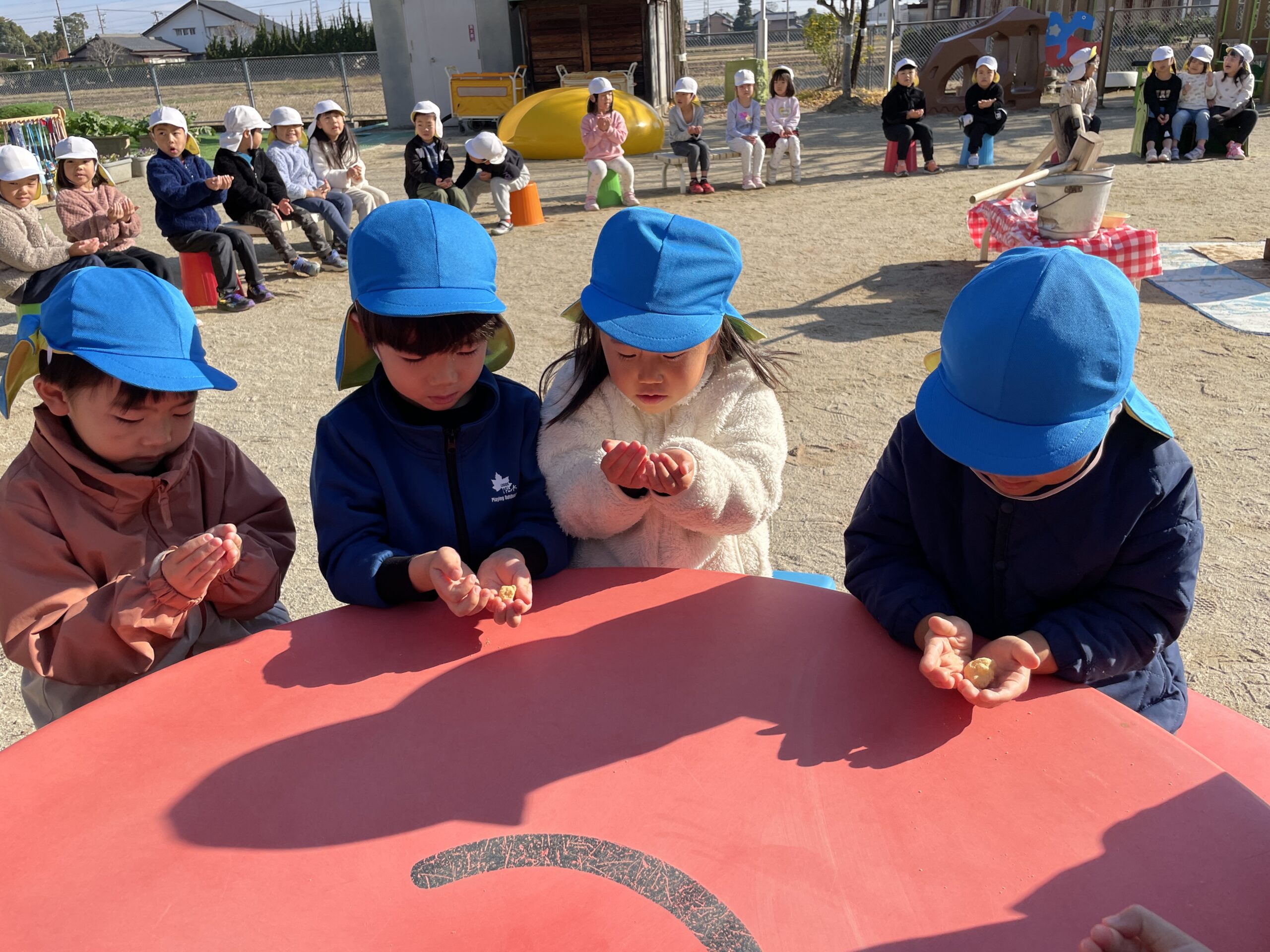 役員さんにもお手伝いいただき、つきたてのおもちが次々が出来上がりました。子どもたちは出来立てのあたたかいきな粉もちを味わい「おいしーい!」と笑顔いっぱいに。