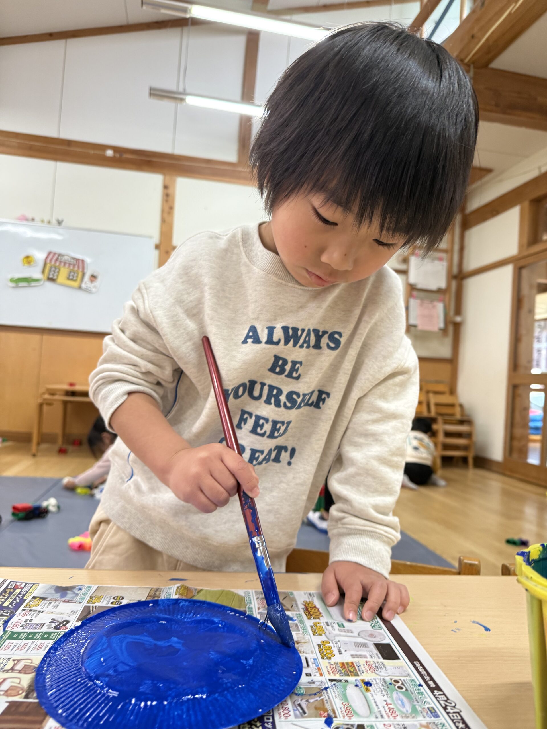 ①紙皿に絵の具を塗って