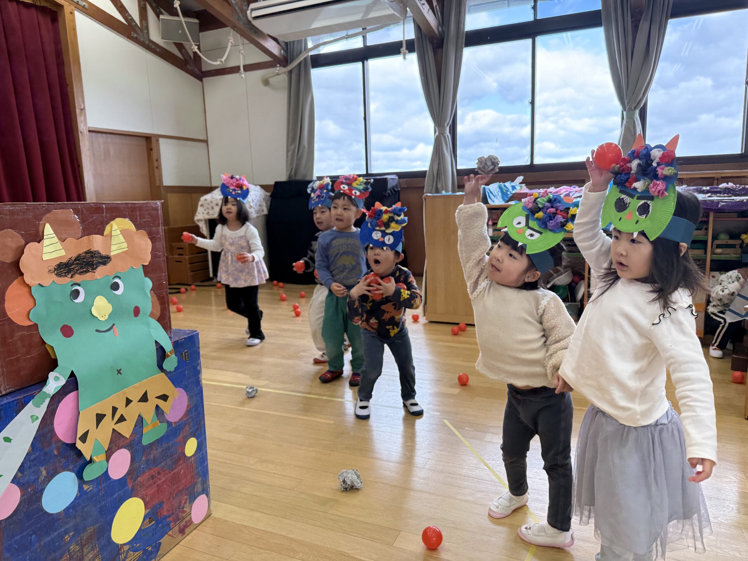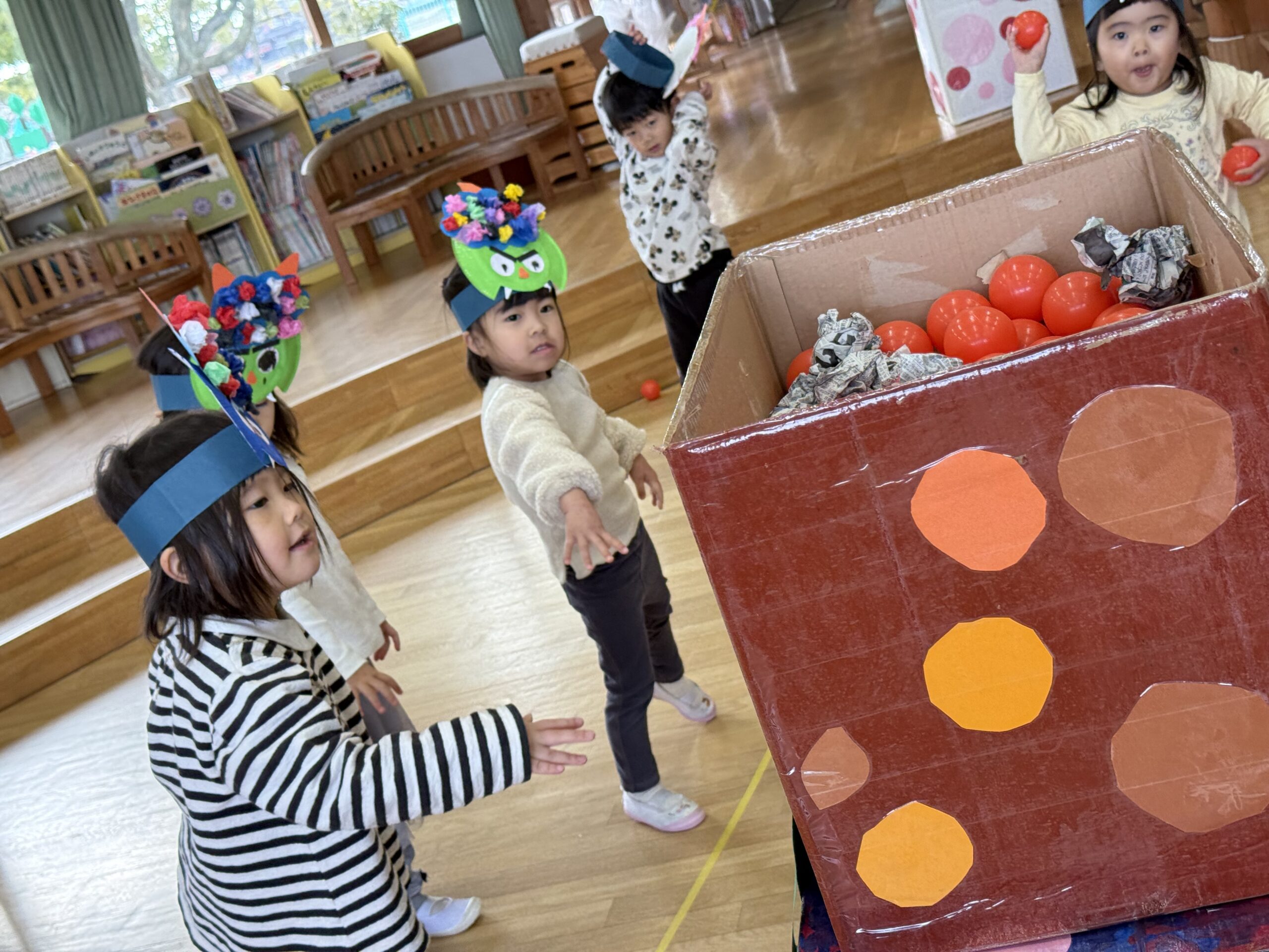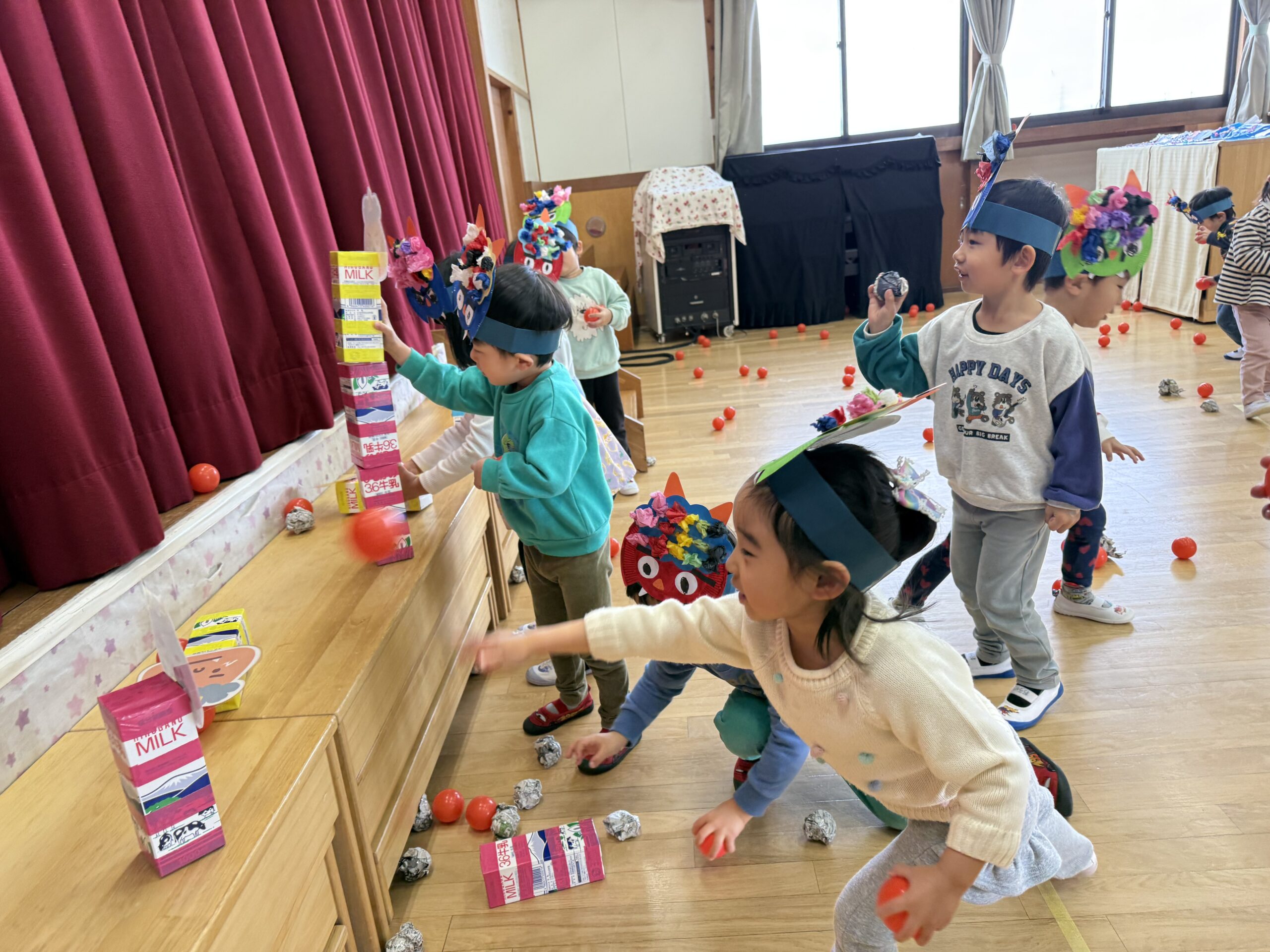 今回は、豆まき玉入れと豆まき倒しを