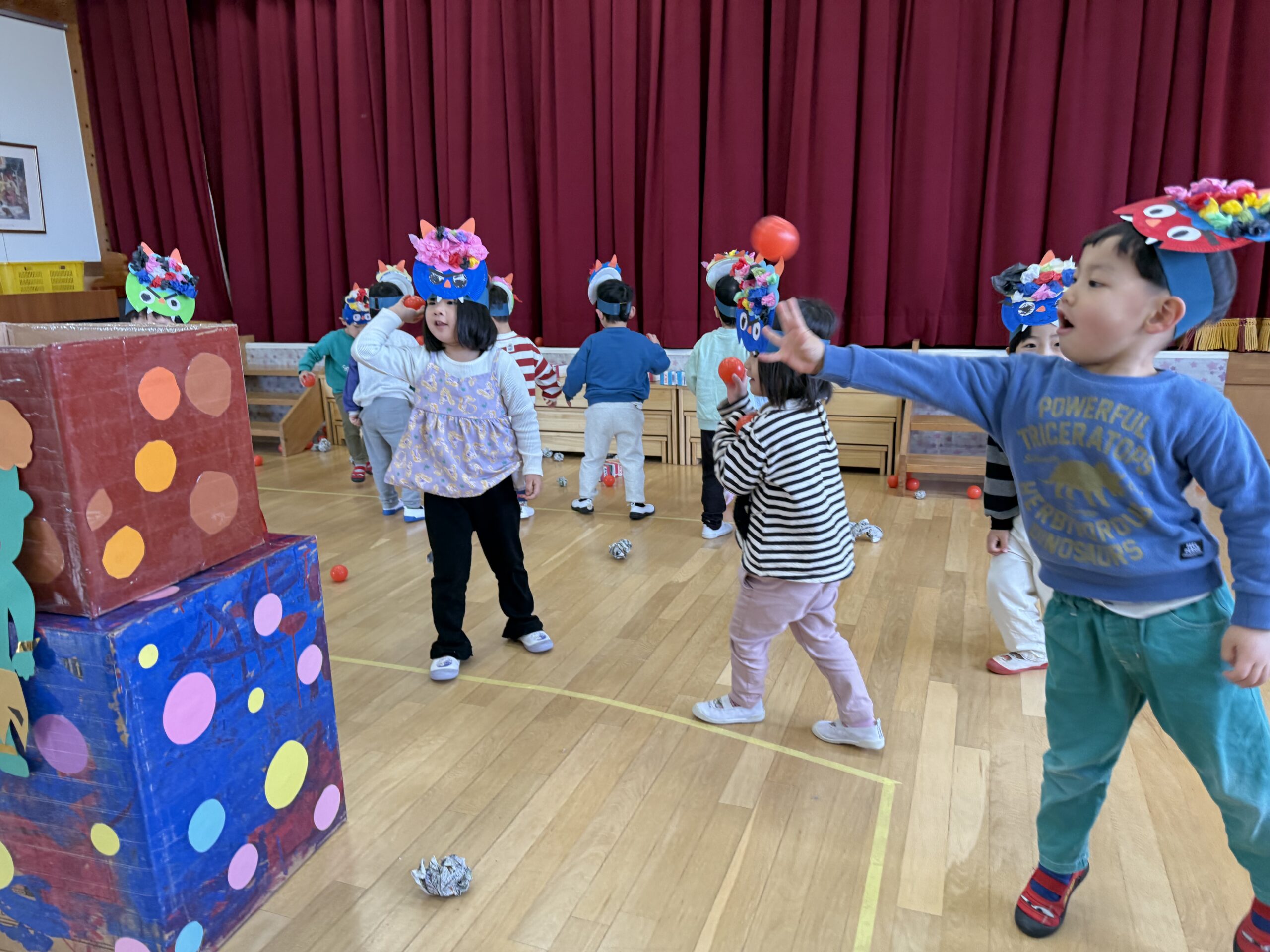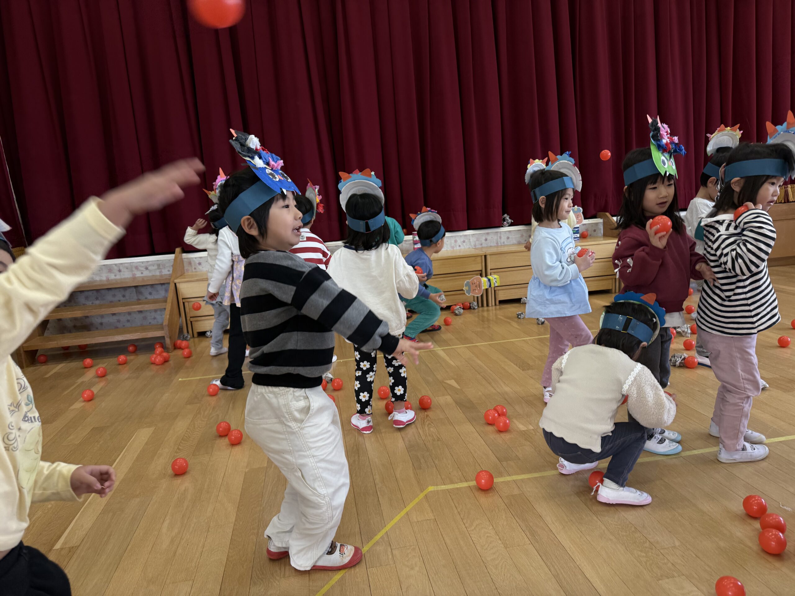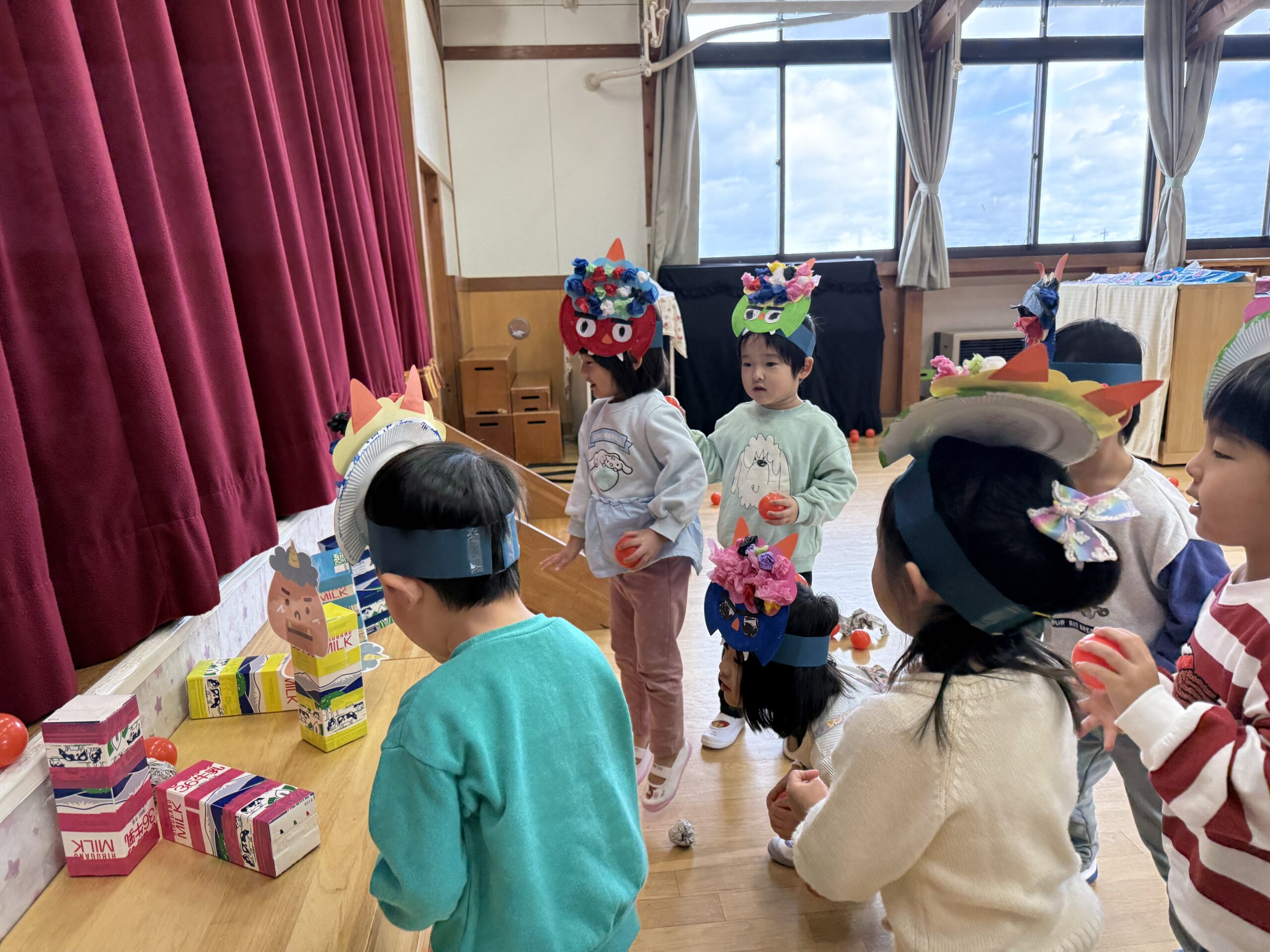今回は、豆まき玉入れと豆まき倒しを