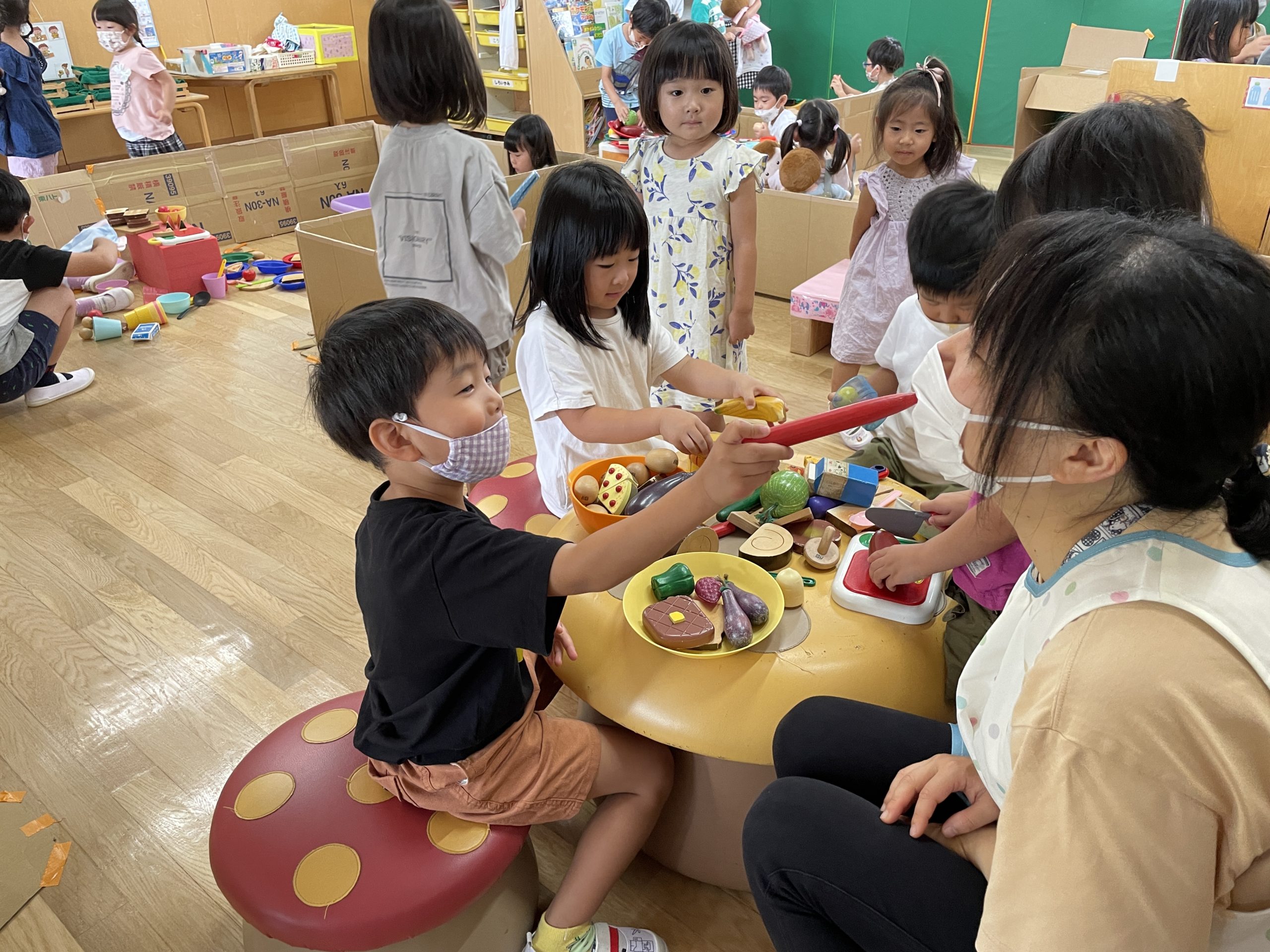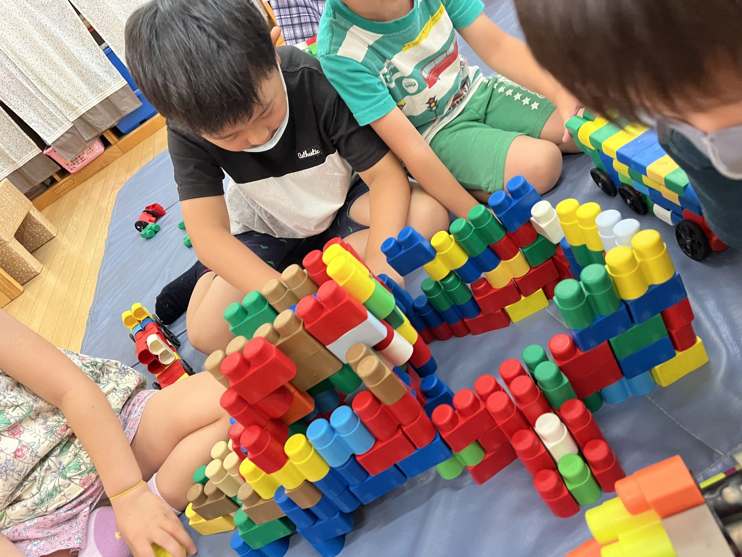 年上の子が組み立てる姿を見て、真似っこしている姿、「ここ、いいよ!」と年下の子に声をかけてくれる姿が少しずつ見られるようになりました。