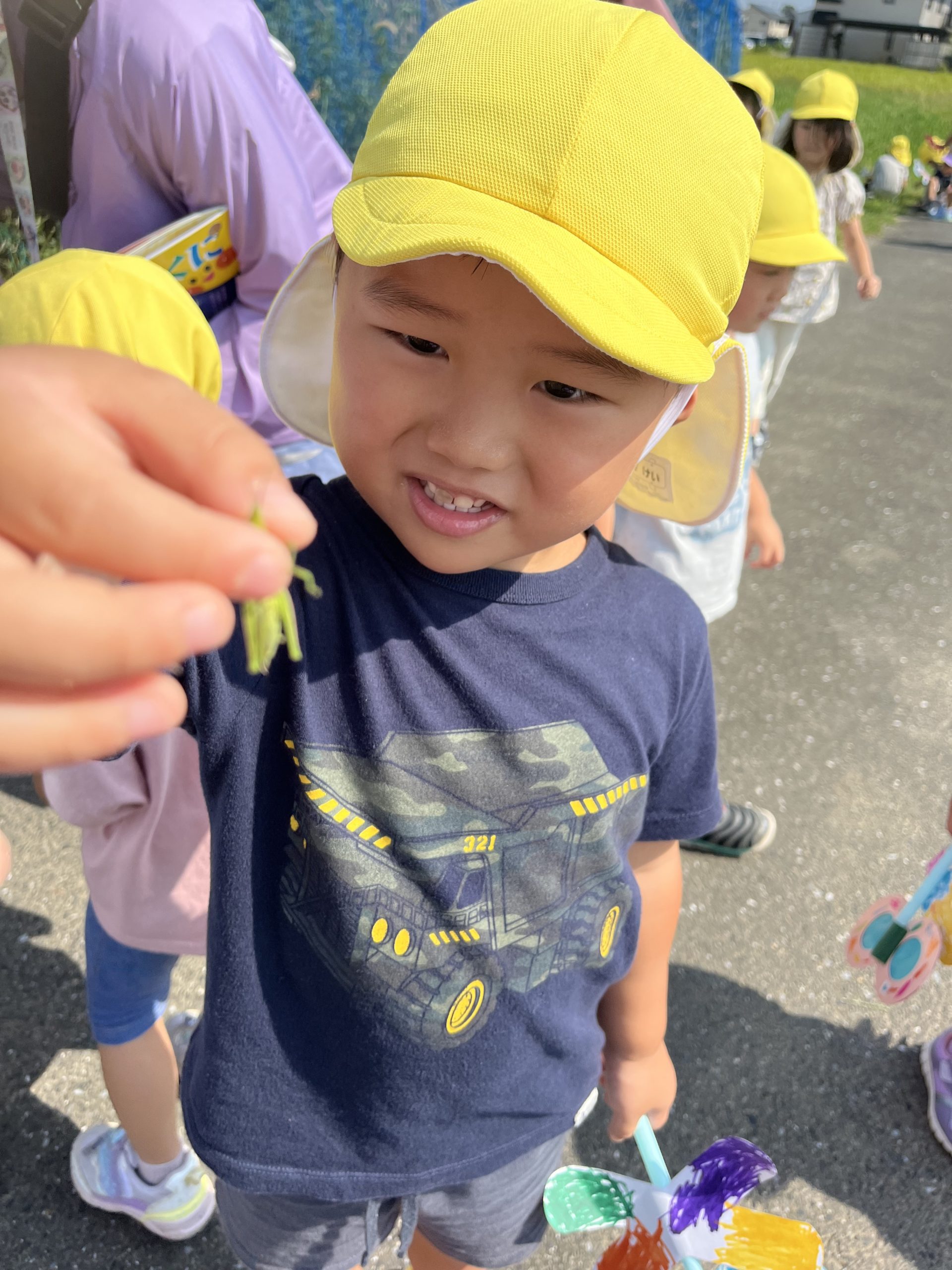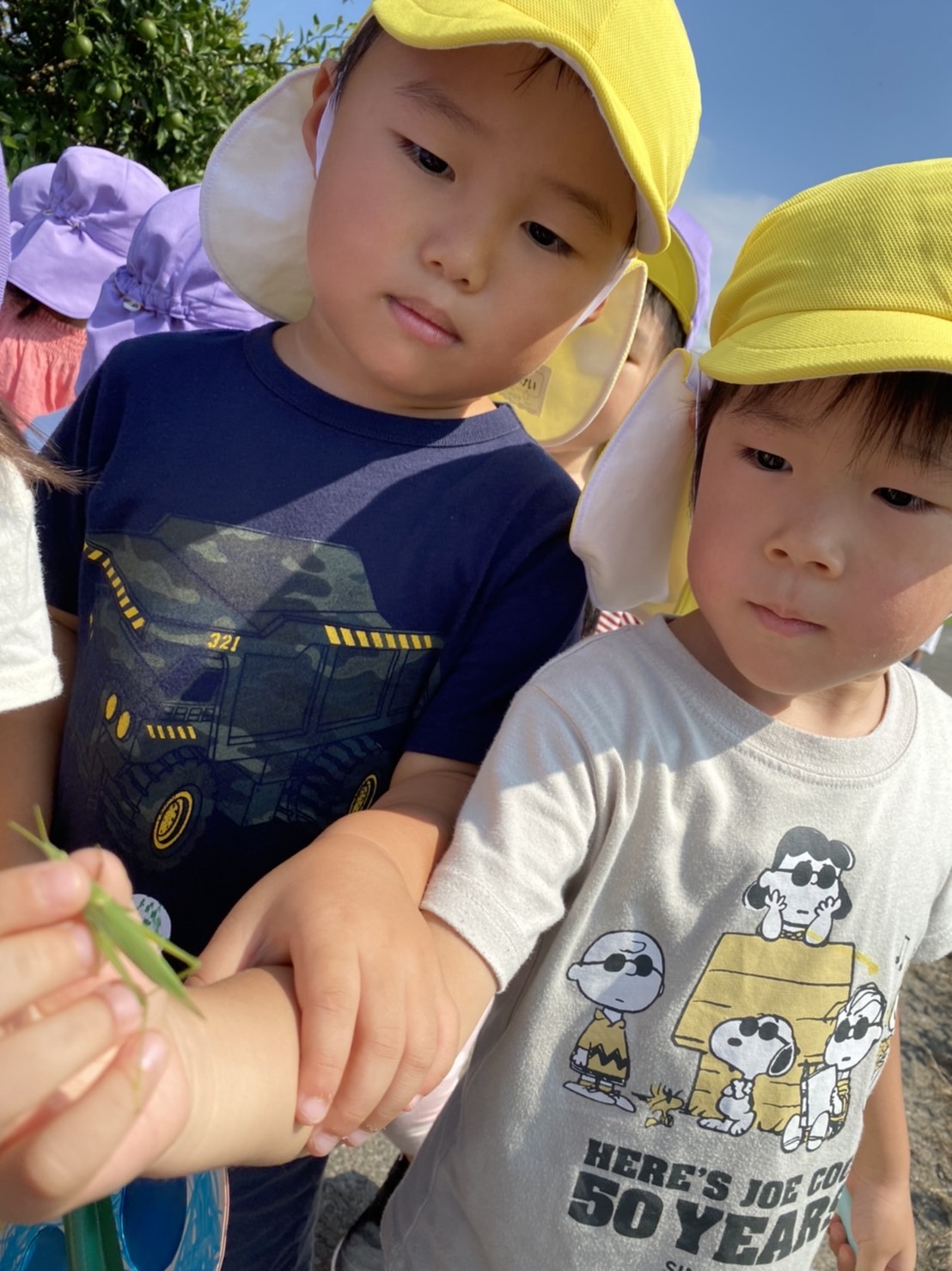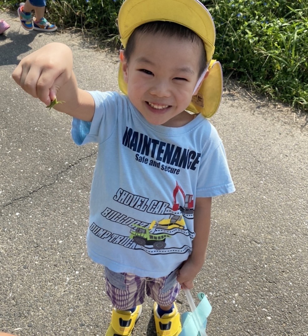 「バッタさん捕まえたよー!先生、見て!」